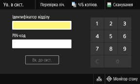 Якщо налаштовано керування ідентифікаторами відділів, відображається наведений нижче екран входу в систему. Введіть ідентифікатор відділу, щоб увійти. Якщо встановлено PIN-код, введіть його.