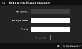 Якщо встановлено надсилання з автентифікацією (автентифікація сервера LDAP), під час виконання операцій сканування та надсилання факсів відображається екран входу в систему для надсилання з автентифікацією. Введіть ім’я користувача та пароль, для керування якими використовується сервер LDAP, щоб увійти в систему.