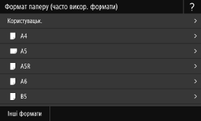 Якщо папір завантажено в альбомній орієнтації, виберіть [A5]. Якщо папір завантажено в книжковій орієнтації, виберіть [A5R].