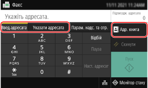 Зазначення адресатівВведіть номер факсу за допомогою клавіш із цифрами чи виберіть зареєстроване місце призначення.
