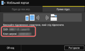 1 | Перевірте ідентифікатор SSID та ключ мережі апарата, що відображаються на вкладці [Пряме підкл.]. |