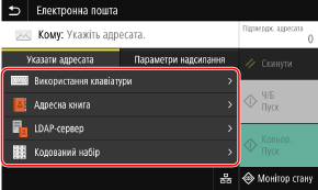 Якщо вибір адресатів у функції надсилання обмежений через параметри автентифікації, ви не зможете вибрати іншого адресата. За докладною інформацією звертайтеся до адміністратора.