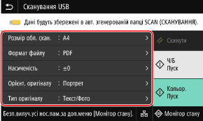 Щоб сканувати оригінал у чорно-білому режимі, натисніть [Пуск Ч/Б]; щоб виконати кольорове сканування, натисніть [Пуск Кольор.].