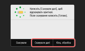 Щоб продовжити сканувати оригінальні примірники, розмістіть їх на сканувальному склі та натисніть [Сканувати далі].
