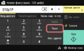 Під час надсилання факсу закордонному адресату введіть номер міжнародного доступу, код країни та номер факсу адресата в зазначеному порядку. Додайте паузу між номерами за допомогою кнопки [Пауза].