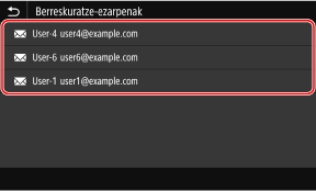 Iraganean erabilitako helmugak zehazteko, ireki TX lan-egunkaria eragiketa-paneleko eskaneatze- edo fax-pantailan. Helmugekin batera datuak bidaltzeko erabilitako eskaneatze-ezarpenak ere aplika ditzakezu.