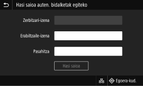 Bidalketa autentifikatua ezarrita dagoenean (LDAP zerbitzariaren autentifikazioa), Bidalketa autentifikatuaren saio-hasierako pantaila bistaratzen da eskaneatze-eta fax-eragiketak burutzen direnean. Sartu LDAP zerbitzariarekin kudeatutako erabiltzaile-izena eta pasahitza saioa hasteko.