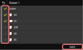 Paper sizes whose checkboxes are cleared are not displayed on the paper settings screen.