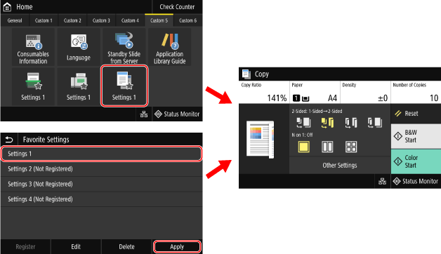 You can call up registered settings for quick operation using the shortcut buttons added to the [Home] screen on the operation panel and the screen of each function. You can also change the settings after calling them up, as needed.