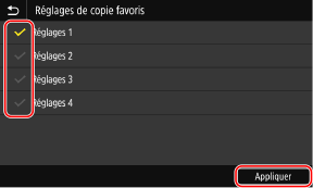 Suppression des boutons de raccourci ajoutésÀ l'étape 4, décochez les cases des paramètres que vous souhaitez supprimer, et appuyez sur [Appliquer]. Lorsque l'écran [Accueil] est complet et qu'il est impossible d'ajouter des boutons de raccourciSupprimez tous les boutons de raccourci inutiles.