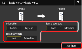 3 | Définissez l'orientation et le type d'ouverture, puis appuyez sur [Appliquer]. L'écran [Autres réglages] s'affiche de nouveau. |