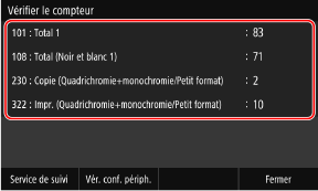 Opérations disponibles sur l'écran de vérification du compteurAppuyez sur [Service de suivi] pour vérifier la connexion au serveur de suivi. Exécutez cette opération pour envoyer régulièrement les informations de l'appareil au serveur de suivi. Appuyez sur [Vér. conf. périph.] pour vérifier la configuration des équipements en option installés sur l'appareil.