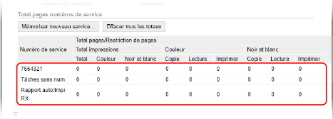 Vous pouvez afficher le nombre de pages imprimées et copiées avec chaque ID de service lorsque la gestion par ID de service est activée.