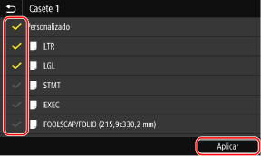Los tamaños de papel cuyas casillas estén desmarcadas no aparecen en la pantalla de configuración del papel.