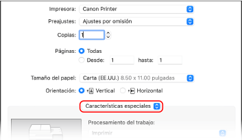 2 | En el menú emergente de opciones de impresión, seleccione [Características especiales]. Si no aparecen las opciones de impresión, haga clic en [Mostrar detalles] en el cuadro de diálogo de impresión. |