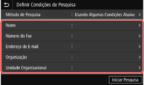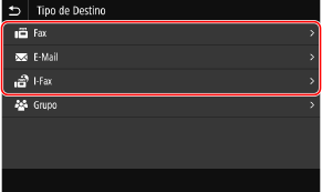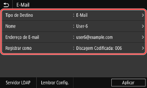 Para obter informações sobre o destino, pressione [Endereço de E-mail], [Endereço de I-Fax], ou [Número do Fax], insira essas informações e pressione [Aplicar].