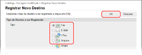 Editando ou excluindo destinos registradosVocê pode editar as informações registradas clicando no destino que deseja editar na tela da Etapa 4. Na Etapa 4, clique em [Excluir] à direita do destino que você deseja excluir e o destino será excluído. Se o destino no catálogo de endereços for especificado com "Configurações Favoritas", a operação de edição ou exclusão também será aplicada a "Configurações Favoritas". Registrando e acessando as configurações favoritas |