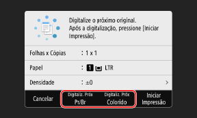 1 | Coloque o próximo original na placa de vidro e pressione [Digitaliz. Próx Pr/Br] ou [Digitaliz. Próx Colorido]. O próximo original é digitalizado e a mesma tela é exibida. Repita este processo até que a digitalização de todos os originais seja concluída. Você pode selecionar o modo de cores (preto e branco ou colorido) para cada original. Para copiar o próximo original em preto e branco, pressione [Digitaliz. Próx Pr/Br]. Para copiar em cores, pressione [Digitaliz. Próx Colorido]. Você também pode pressionar [Densidade], [Tipo de Original] e [Proporção de Cores] para alterar as configurações de cada original. Se o tamanho do original for diferente, parte da imagem pode ficar faltando a imagem pode ser impressa menor no papel. |