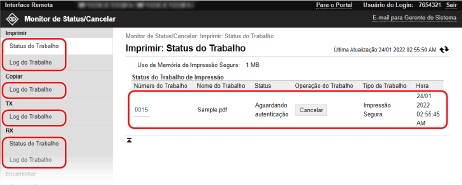 Clique em [Cancelar] em [Operação do Trabalho] para excluir os dados de impressão dos trabalhos que estão sendo impressos ou em espera.