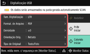 | | Você pode digitalizar um original e salvar os dados digitalizados em um dispositivo de memória USB conectado à máquina. Isso é conveniente ao usar dados digitalizados em um computador sem conexão de rede ou quando estiver em trânsito. |