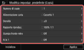 Selezionare le voci di impostazione da modificare, quindi modificare le impostazioni predefinite.