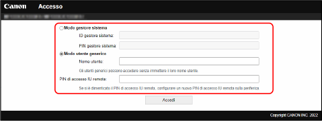 Per utilizzare la IU remota, inserire l’indirizzo IP della macchina in un browser web su un computer e accedere in modalità Gestore sistema o utente generico. Le funzioni disponibili con la IU remota variano a seconda della modalità con cui si accede.