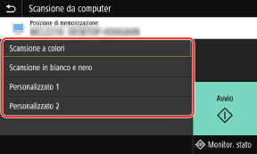 Per ciascuna impostazione di scansione sono impostati il formato dei dati scansionati, la posizione di salvataggio sul computer e altro. L'originale viene scansionato in base all'impostazione di scansione selezionata.