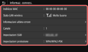 Oltre all'indirizzo MAC e alle informazioni di connessione della LAN wireless, quando la macchina è connessa a una LAN wireless, è possibile vedere anche le impostazioni di sicurezza.