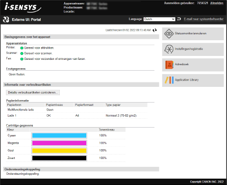 Als u inlogt bij Externe UI, verschijnt de Portal-pagina (bovenste pagina, Externe UI). Hier kunt u de bedieningsstatus van het apparaat controleren, verschillende soorten informatie bekijken, en instellingen wijzigen met knopbedieningen.