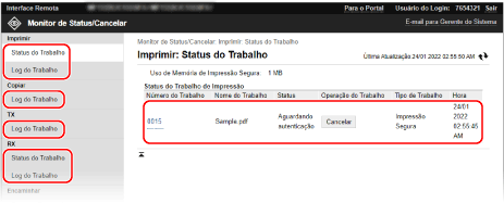 Clique em [Número do Trabalho] para impressões em pausa e impressões protegidas para apresentar os detalhes de impressão e ver o nome de utilizador e o número de folhas impressas.