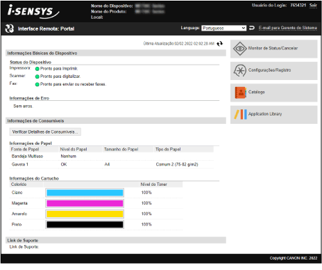 Quando inicia sessão na IU remota, aparece a página do portal (página superior da IU remota). Aqui, pode verificar o estado de funcionamento da máquina, visualizar várias informações e alterar as definições com o botão de operações.