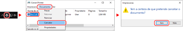 Se o ecrã acima não for apresentado, clique duas vezes no ícone da impressora na área de notificações do Windows, selecione o documento que pretende cancelar e clique em [Documento] [Cancelar] [Sim].