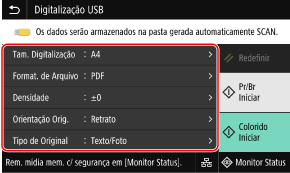 Se o ecrã de operação de suporte de memória for apresentado, prima [Digitalização USB] e avance para o passo 5.