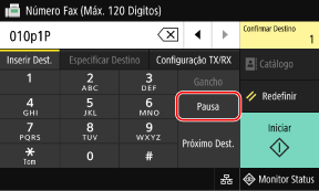 Inicie sessão na IU remota [Configurações/Registro] [Configurações de TX] [Configurações de TX de Fax] [Editar] em [Definir Tempo de Pausa], introduza o tempo de pausa [OK]