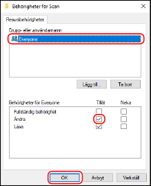 2 | I [Behörigheter] ska du markera kryssrutan [Tillåt] i [Ändra]. |