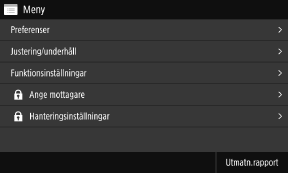 Ändra skärminställningarDu kan ändra inställningarna för hur kontrollpanelen visas. Du kan t.ex. ändra språk och måttenheter samt visa eller dölja meddelanden. [Skärminställningar] Du kan invertera färgerna och ändra ljusstyrkan för att det ska vara lättare att läsa på skärmen. [Hjälpmedel] Ta bort inställningar automatisktOm ingen åtgärd har utförts under en viss tidsperiod är standardinställningen att angivna inställningar på skärmen tas bort och skärmen [Hem] visas. Du kan ändra tiden tills inställningarna tas bort och nästa skärm visas. [Autoåterställning av tid] [Funktion eft. autoåterställn.] |