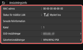Förutom MAC-adressen och anslutningsinformationen för trådlöst LAN, när enheten är ansluten till trådlöst LAN, kan du även visa säkerhetsinställningarna.