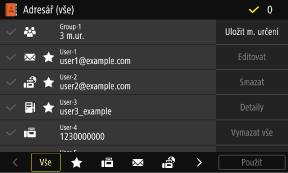 Pokud vyvoláte adresář z obrazovky [Domů] nebo z obrazovek skenování či faxování, objeví se následující obrazovka.