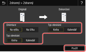 Podle potřeby nastavte orientaci originálu a typ otvírání a typ otvírání kopie.