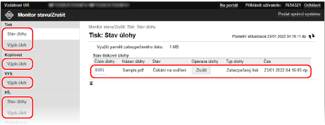 Toto zobrazí stav všech tiskových úloh bez ohledu na nastavení správy ID oddělení.