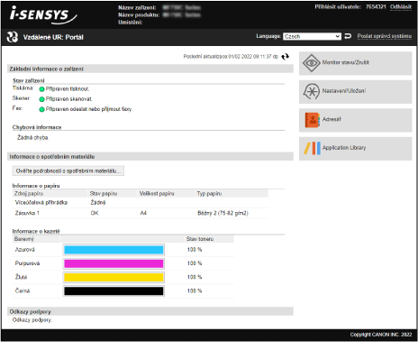 Když se přihlásíte do vzdáleného uživatelského rozhraní, zobrazí se stránka portálu (domovská stránka vzdáleného uživatelské rozhraní). Odsud můžete kontrolovat provozní stav zařízení, zobrazovat různé informace a měnit nastavení pomocí operací s tlačítky.