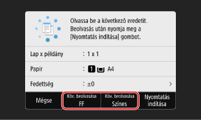 A színmódot (fekete-fehér vagy színes) miden eredeti dokumentumhoz külön beállíthatja. Ha fekete-fehérben szeretné másolni a következő dokumentumot, nyomja meg a [Köv. beolvasása FF] lehetőséget. Színes másoláshoz nyomja meg a [Köv. beolvasása Színes] lehetőséget.
