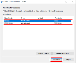 Ha nem jelenik meg a készülék a [Készüléklista] részen, akkor kattintson az [Ismételt Keresés] lehetőségre. Ha a készülék továbbra sem jelenik meg, kattintson a [Keresés IP-cím után] lehetőségre, írja be a készülék IP-címét, majd kattintson az [OK] gombra.