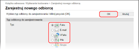 Jeśli podczas wysyłania faksu do międzynarodowego miejsca przeznaczenia wystąpi błąd komunikacji, wybierz [Międzynarodowe (1)]. Jeśli problem nie zostanie rozwiązany, wybierz [Międzynarodowe (2)] i [Międzynarodowe (3)] w tej kolejności.