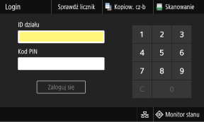 Kiedy skonfigurowane jest zarządzanie identyfikatorami wydziałów, wyświetlany jest następujący ekran logowania. Aby się zalogować, wprowadź identyfikator wydziału. Jeśli ustawiony jest kod PIN, wprowadź go.
