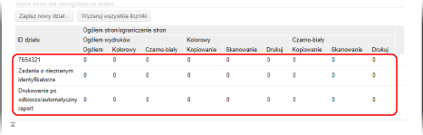 Gdy włączone jest zarządzanie identyfikatorami wydziałów, możesz zobaczyć liczbę stron wydrukowanych i skopiowanych dla każdego identyfikatora wydziału.