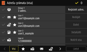 Šie tiek rādīti ekrāna labajā pusē. Nospiediet, lai adresātu reģistrētu, rediģētu vai izdzēstu vai lai norādītu adresātu, kuram sūtīt vai kurā saglabāt datus.