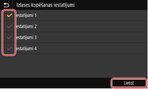 Atzīmējiet izvēles rūtiņas iestatījumiem, kurus vēlaties piešķirt kā īsceļu pogas, un nospiediet [Lietot].