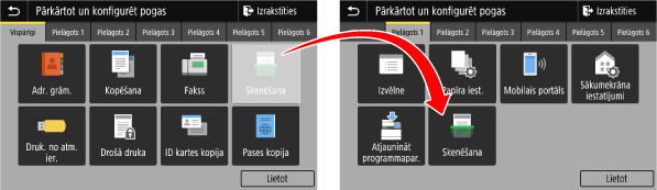 Pievienojiet īsceļu pogas, izmantot vadības paneli. Pogas pievienot nevar, izmantojot līdzekli Remote UI (Attālais lietotāja interfeiss) no datora.