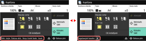 ]. Pēc noklusējuma ekrāns [Sākums] tiek parādīts pēc iekārtas ieslēgšanas un uzreiz pēc sākšanas ekrāna aizvēršanas, un uzreiz pēc pieteikšanās. Ekrāns [Sākums]